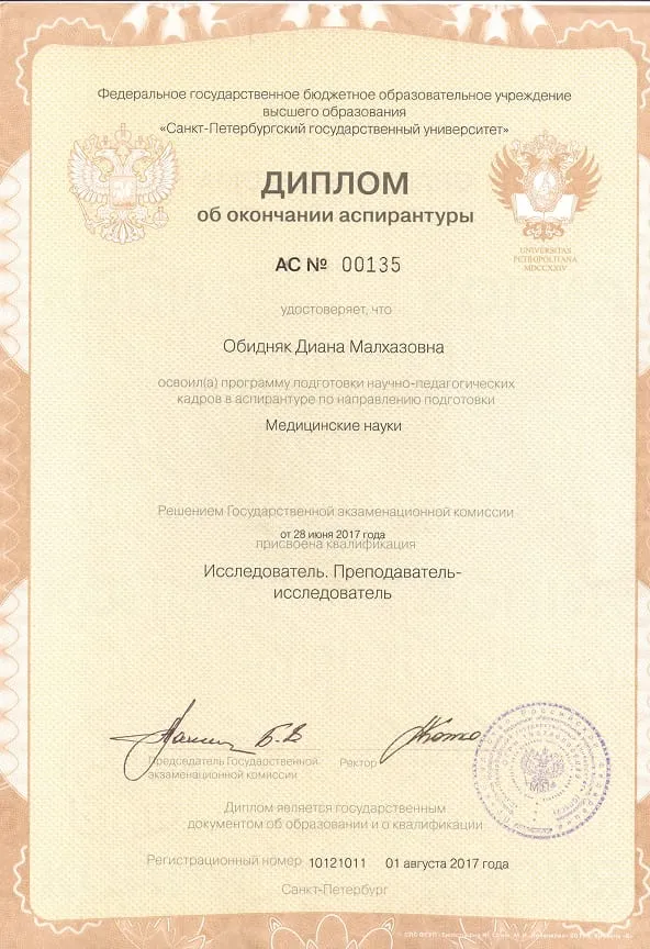 - Санкт-Петербургский государственный медицинский университет им. И.П. Павлова по специальности «Лечебное дело»